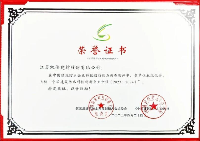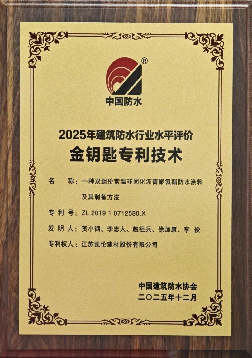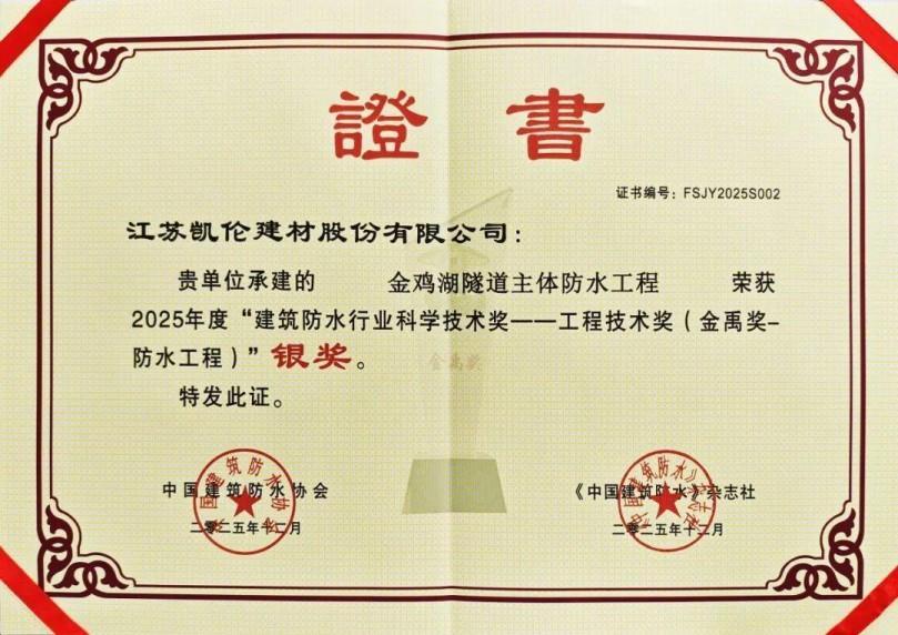 ' Sơn phủ chống thấm nhựa đường Polyurethane hai thành phần không lưu hóa ở nhiệt độ phòng và phương pháp chuẩn bị của nó' (ZL 201910712580.X) đã giành được Giải thưởng Công nghệ Bằng sáng chế 'Chìa khóa Vàng'; dự án chống thấm chính Đường hầm hồ Jinji đã giành được giải bạc trong Giải thưởng Công nghệ Kỹ thuật (Giải thưởng Jinyu), thể hiện mạnh mẽ chất lượng tuyệt vời của hệ thống chống thấm tích hợp.