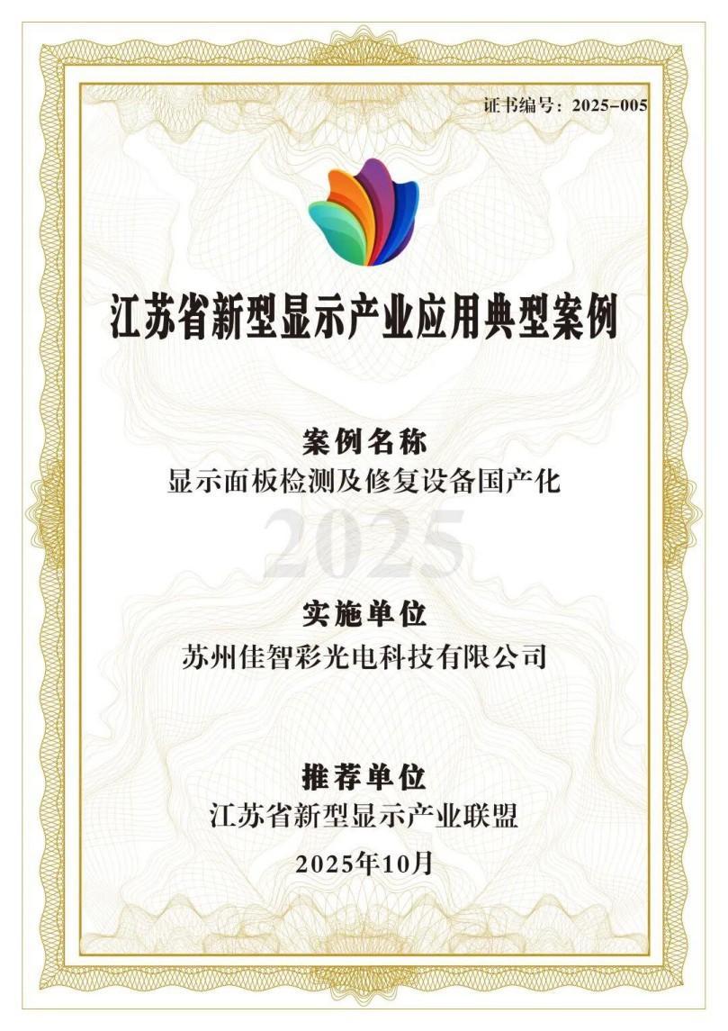 Vào tháng 10, Liên minh Công nghiệp Màn hình Mới Tỉnh Giang Tô đã lựa chọn và khen thưởng các trường hợp điển hình về ứng dụng màn hình mới ở Tỉnh Giang Tô cho năm 2025. Công ty TNHH Công nghệ Quang Điện tử Tô Châu Jiazhicai nổi bật với dự án 'Nội hóa Thiết bị Kiểm tra và Sửa chữa Bảng hiển thị' và được công nhận là trường hợp điển hình trong lĩnh vực sản xuất công nghiệp.