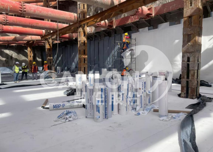Áp dụng 'công nghệ chống thấm ngược dán ngược cho công trình ngầm', sử dụng màng chống thấm tự dính ' Canlon ' MBP-P polymer + màng chống thấm polymer MBP-W làm hệ thống lớp chống thấm chính. Hệ thống chống thấm này được thi công bằng cách sử dụng ' phương pháp dán ngược ', đặt lỏng lẻo trên lớp nền, có thể tạo thành một liên kết chắc chắn với bê tông được đổ sau đó, chống lại sự lún và biến dạng của lớp nền một cách hiệu quả. Ngay cả khi lớp chống thấm bị hư hỏng một phần, đặc tính kết dính ngược có thể ngăn chặn sự thấm nước. Trên bề mặt lớp san lấp của cọc đỡ, vật liệu chống thấm tinh thể xuyên thấu gốc xi măng được sử dụng kết hợp. Các thành phần hoạt tính của nó kết tinh khi tiếp xúc với nước, thấm sâu vào các lỗ mao mạch của bê tông để đạt được khả năng chống thấm tự phục hồi, tạo thành một 'hàng rào kép' với màng.