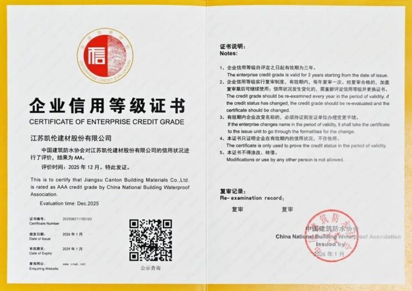 Gần đây, Canlon , dựa trên sức mạnh toàn diện và hiệu quả kinh doanh đáng tin cậy, đã được Hiệp hội chống thấm tòa nhà Trung Quốc trao tặng xếp hạng tín dụng cao nhất—AAA—sau khi xem xét nghiêm ngặt. Chứng chỉ tín dụng AAA có giá trị từ năm 2026 đến năm 2029. Điều này không chỉ ghi nhận cao độ uy tín doanh nghiệp và giá trị thương hiệu của Canlon mà còn thể hiện vai trò gương mẫu của công ty trong việc thúc đẩy xây dựng hệ thống tín dụng của ngành. Canon đã nhận được xếp hạng tín nhiệm cao nhất này trong nhiều năm liên tiếp.