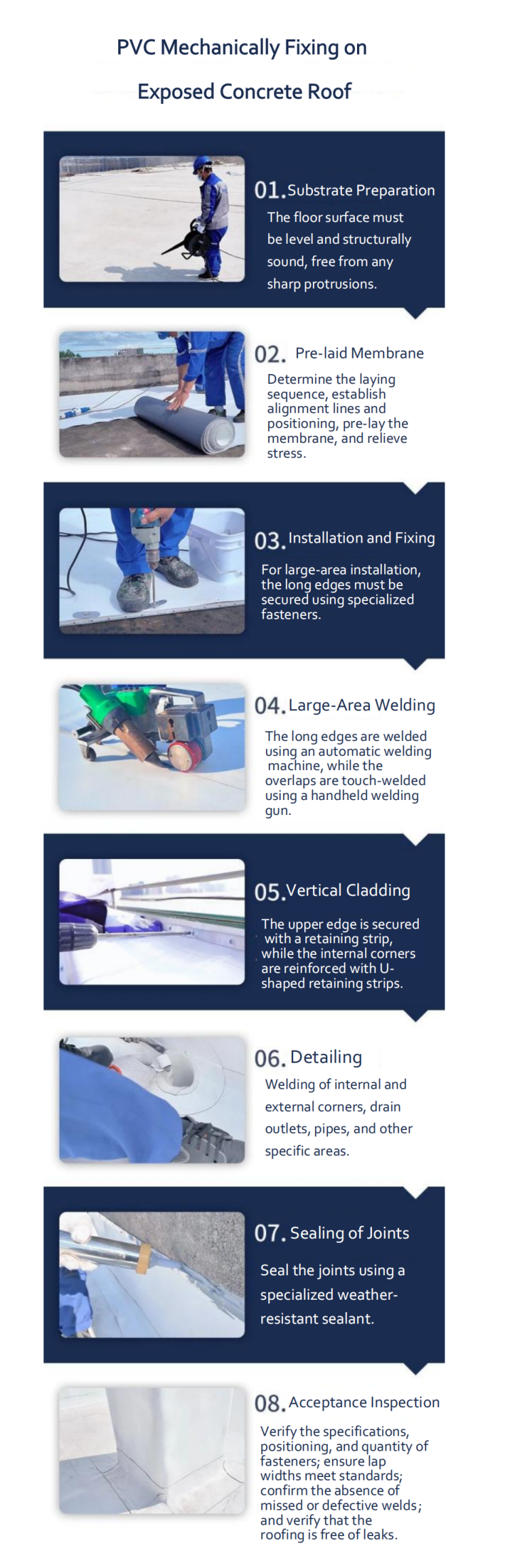 Dù là chống thấm và cải tạo mái nhà dân dụng hay chống thấm thi công mái bê tông cho cửa hàng và nhà máy, giải pháp cố định cơ khí PVC cho mái bê tông đã trở thành lựa chọn rất phổ biến trong những năm gần đây do ưu điểm là hiệu quả cao, độ ổn định cao và khả năng thích ứng rộng rãi trong số nhiều giải pháp chống thấm.